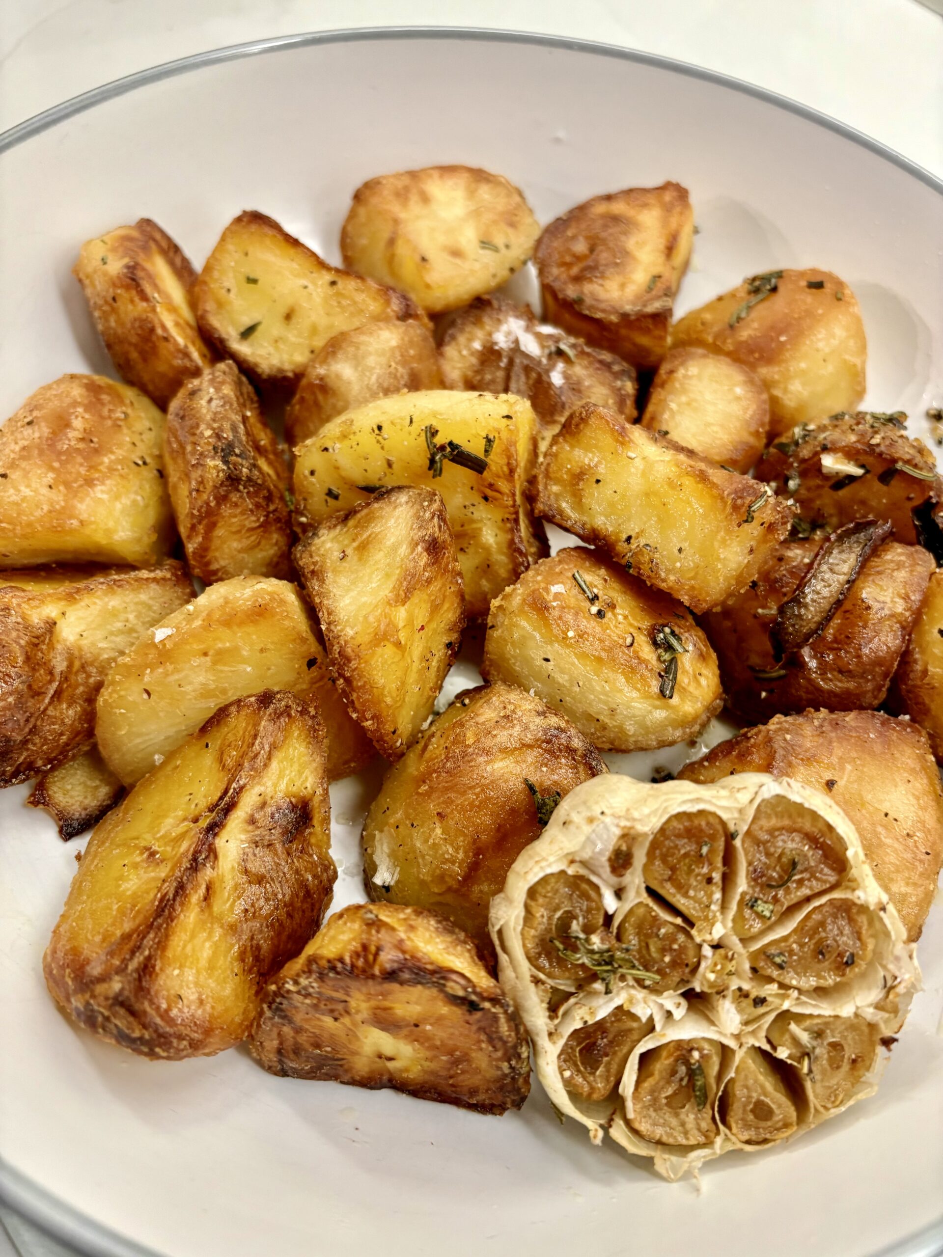 • After 30 minutes, turn them, add a bulb of garlic, a drizzle of extra virgin olive oil, fresh rosemary and lemon peel. Place back in the oven for another 30-40 minutes. This method will guarantee the most delicious roast potatoes. Crunchy on the outside, nice and fluffy on the inside.