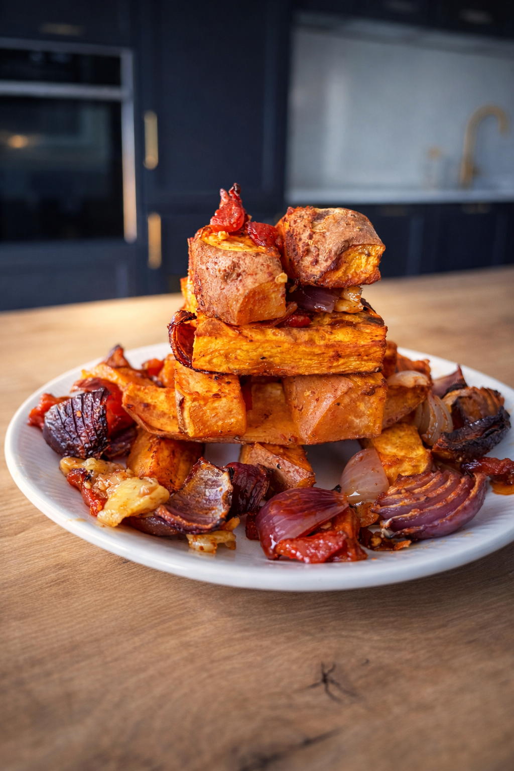 Cheesy pesto eggs served with air fryer sweet potato toast